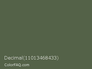 Decimal 11013468433 Color is a normal green color and the nearest color is Axolotl #4e6649. Hex code #546347 and RGB value is rgb(84,99,71). In RGB color space, this color is composed of 33% red, 39% green, 28% blue, In CMYK color space, this color is composed of 15% cyan, 0% magenta, 28% yellow , 61% black , In HSL color space, this color has a hue angle of 92° , 16% saturation and 33% lightness.