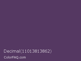 Decimal 11013813862 Color is a dark purple color and the nearest color is English Violet #563c5c. Hex code #553862 and RGB value is rgb(85,56,98). In RGB color space, this color is composed of 33% red, 22% green, 38% blue, In CMYK color space, this color is composed of 13% cyan, 43% magenta, 0% yellow , 62% black , In HSL color space, this color has a hue angle of 281° , 27% saturation and 30% lightness.