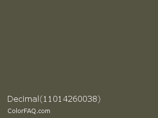 Decimal 11014260038 Color is a dark yellow color and the nearest color is Fuscous Gray #54534d. Hex code #555342 and RGB value is rgb(85,83,66). In RGB color space, this color is composed of 33% red, 33% green, 26% blue, In CMYK color space, this color is composed of 0% cyan, 2% magenta, 22% yellow , 67% black , In HSL color space, this color has a hue angle of 54° , 13% saturation and 30% lightness.