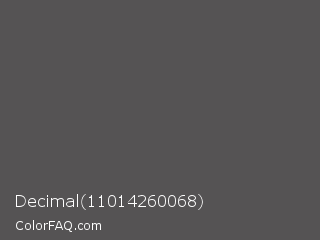 Decimal 11014260068 Color is a normal rose color and the nearest color is Davys Grey #555555. Hex code #555354 and RGB value is rgb(85,83,84). In RGB color space, this color is composed of 33% red, 33% green, 33% blue, In CMYK color space, this color is composed of 0% cyan, 2% magenta, 1% yellow , 67% black , In HSL color space, this color has a hue angle of 330° , 1% saturation and 33% lightness.