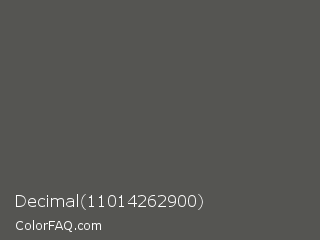Decimal 11014262900 Color is a normal yellow color and the nearest color is Davys Grey #555555. Hex code #555552 and RGB value is rgb(85,85,82). In RGB color space, this color is composed of 33% red, 33% green, 32% blue, In CMYK color space, this color is composed of 0% cyan, 0% magenta, 4% yellow , 67% black , In HSL color space, this color has a hue angle of 60° , 2% saturation and 33% lightness.