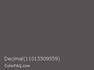 Decimal 11015509559 Color is a normal rose color and the nearest color is Davys Grey #555555. Hex code #575355 and RGB value is rgb(87,83,85). In RGB color space, this color is composed of 34% red, 33% green, 33% blue, In CMYK color space, this color is composed of 0% cyan, 5% magenta, 2% yellow , 66% black , In HSL color space, this color has a hue angle of 330° , 2% saturation and 33% lightness.