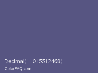 Decimal 11015512468 Color is a normal indigo color and the nearest color is Purple Navy #4e5180. Hex code #575582 and RGB value is rgb(87,85,130). In RGB color space, this color is composed of 34% red, 33% green, 51% blue, In CMYK color space, this color is composed of 33% cyan, 35% magenta, 0% yellow , 49% black , In HSL color space, this color has a hue angle of 243° , 21% saturation and 42% lightness.
