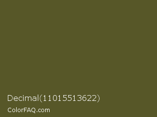 Decimal 11015513622 Color is a dark yellow color and the nearest color is Woodland #4d5328. Hex code #575728 and RGB value is rgb(87,87,40). In RGB color space, this color is composed of 34% red, 34% green, 16% blue, In CMYK color space, this color is composed of 0% cyan, 0% magenta, 54% yellow , 66% black , In HSL color space, this color has a hue angle of 60° , 37% saturation and 25% lightness.