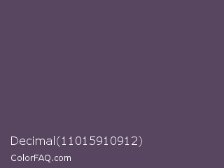 Decimal 11015910912 Color is a normal purple color and the nearest color is English Violet #563c5c. Hex code #584560 and RGB value is rgb(88,69,96). In RGB color space, this color is composed of 35% red, 27% green, 38% blue, In CMYK color space, this color is composed of 8% cyan, 28% magenta, 0% yellow , 62% black , In HSL color space, this color has a hue angle of 282° , 16% saturation and 32% lightness.