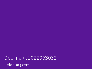 Decimal 11022963032 Color is a normal purple color and the nearest color is Daisy Bush #4f2398. Hex code #591696 and RGB value is rgb(89,22,150). In RGB color space, this color is composed of 35% red, 9% green, 59% blue, In CMYK color space, this color is composed of 41% cyan, 85% magenta, 0% yellow , 41% black , In HSL color space, this color has a hue angle of 271° , 74% saturation and 34% lightness.