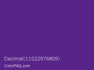 Decimal 11022976809 Color is a normal purple color and the nearest color is KSU Purple #512888. Hex code #592489 and RGB value is rgb(89,36,137). In RGB color space, this color is composed of 35% red, 14% green, 54% blue, In CMYK color space, this color is composed of 35% cyan, 74% magenta, 0% yellow , 46% black , In HSL color space, this color has a hue angle of 271° , 58% saturation and 34% lightness.