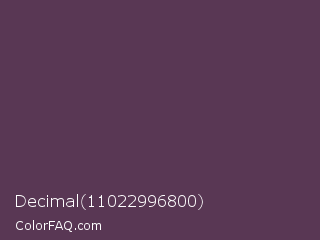 Decimal 11022996800 Color is a dark magenta color and the nearest color is Dark Byzantium #5d3954. Hex code #593754 and RGB value is rgb(89,55,84). In RGB color space, this color is composed of 35% red, 22% green, 33% blue, In CMYK color space, this color is composed of 0% cyan, 38% magenta, 6% yellow , 65% black , In HSL color space, this color has a hue angle of 309° , 24% saturation and 28% lightness.