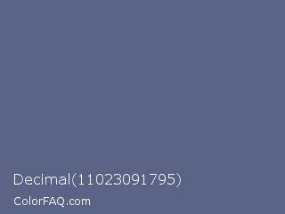 Decimal 11023091795 Color is a normal blue color and the nearest color is Paynes Grey #536878. Hex code #596385 and RGB value is rgb(89,99,133). In RGB color space, this color is composed of 35% red, 39% green, 52% blue, In CMYK color space, this color is composed of 33% cyan, 26% magenta, 0% yellow , 48% black , In HSL color space, this color has a hue angle of 226° , 20% saturation and 44% lightness.