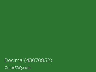 Decimal 43070852 Color is a normal green color and the nearest color is Mughal Green #306030. Hex code #2c7530 and RGB value is rgb(44,117,48). In RGB color space, this color is composed of 17% red, 46% green, 19% blue, In CMYK color space, this color is composed of 62% cyan, 0% magenta, 59% yellow , 54% black , In HSL color space, this color has a hue angle of 123° , 45% saturation and 32% lightness.