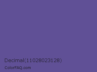 Decimal 11028023128 Color is a normal indigo color and the nearest color is Butterfly Bush #624e9a. Hex code #605096 and RGB value is rgb(96,80,150). In RGB color space, this color is composed of 38% red, 31% green, 59% blue, In CMYK color space, this color is composed of 36% cyan, 47% magenta, 0% yellow , 41% black , In HSL color space, this color has a hue angle of 254° , 30% saturation and 45% lightness.