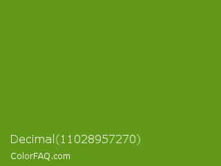Decimal 11028957270 Color is a normal green color and the nearest color is Vida Loca #549019. Hex code #619918 and RGB value is rgb(97,153,24). In RGB color space, this color is composed of 38% red, 60% green, 9% blue, In CMYK color space, this color is composed of 37% cyan, 0% magenta, 84% yellow , 40% black , In HSL color space, this color has a hue angle of 86° , 73% saturation and 35% lightness.