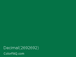Decimal 2692692 Color is a dark green color and the nearest color is Dartmouth Green #00703c. Hex code #047346 and RGB value is rgb(4,115,70). In RGB color space, this color is composed of 2% red, 45% green, 27% blue, In CMYK color space, this color is composed of 97% cyan, 0% magenta, 39% yellow , 55% black , In HSL color space, this color has a hue angle of 156° , 93% saturation and 23% lightness.