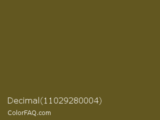 Decimal 11029280004 Color is a dark yellow color and the nearest color is Antique Bronze #665d1e. Hex code #625720 and RGB value is rgb(98,87,32). In RGB color space, this color is composed of 38% red, 34% green, 13% blue, In CMYK color space, this color is composed of 0% cyan, 11% magenta, 67% yellow , 62% black , In HSL color space, this color has a hue angle of 50° , 51% saturation and 25% lightness.