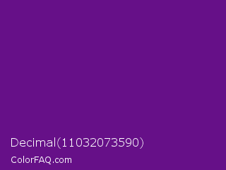 Decimal 11032073590 Color is a dark purple color and the nearest color is Seance #731e8f. Hex code #661088 and RGB value is rgb(102,16,136). In RGB color space, this color is composed of 40% red, 6% green, 53% blue, In CMYK color space, this color is composed of 25% cyan, 88% magenta, 0% yellow , 47% black , In HSL color space, this color has a hue angle of 283° , 79% saturation and 30% lightness.