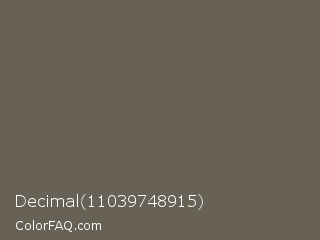 Decimal 11039748915 Color is a normal orange color and the nearest color is Soya Bean #6a6051. Hex code #686155 and RGB value is rgb(104,97,85). In RGB color space, this color is composed of 41% red, 38% green, 33% blue, In CMYK color space, this color is composed of 0% cyan, 7% magenta, 18% yellow , 59% black , In HSL color space, this color has a hue angle of 38° , 10% saturation and 37% lightness.