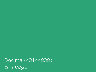 Decimal 43144838 Color is a normal green color and the nearest color is Green Crayola #1cac78. Hex code #2ca476 and RGB value is rgb(44,164,118). In RGB color space, this color is composed of 17% red, 64% green, 46% blue, In CMYK color space, this color is composed of 73% cyan, 0% magenta, 28% yellow , 36% black , In HSL color space, this color has a hue angle of 157° , 58% saturation and 41% lightness.