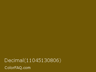 Decimal 11045130806 Color is a dark yellow color and the nearest color is Antique Bronze #704a07. Hex code #705804 and RGB value is rgb(112,88,4). In RGB color space, this color is composed of 44% red, 35% green, 2% blue, In CMYK color space, this color is composed of 0% cyan, 21% magenta, 96% yellow , 56% black , In HSL color space, this color has a hue angle of 47° , 93% saturation and 23% lightness.
