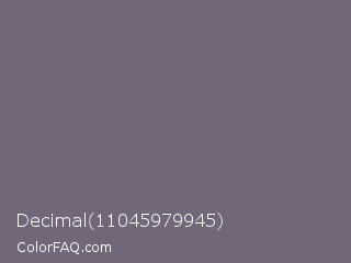Decimal 11045979945 Color is a normal purple color and the nearest color is Old Lavender #796878. Hex code #716779 and RGB value is rgb(113,103,121). In RGB color space, this color is composed of 44% red, 40% green, 47% blue, In CMYK color space, this color is composed of 7% cyan, 15% magenta, 0% yellow , 53% black , In HSL color space, this color has a hue angle of 273° , 8% saturation and 44% lightness.