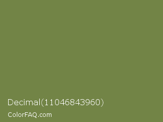 Decimal 11046843960 Color is a normal lime color and the nearest color is Palm Leaf #6f9940. Hex code #728446 and RGB value is rgb(114,132,70). In RGB color space, this color is composed of 45% red, 52% green, 27% blue, In CMYK color space, this color is composed of 14% cyan, 0% magenta, 47% yellow , 48% black , In HSL color space, this color has a hue angle of 77° , 31% saturation and 40% lightness.