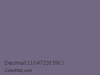 Decimal 11047231591 Color is a normal violet color and the nearest color is Rum #796989. Hex code #736883 and RGB value is rgb(115,104,131). In RGB color space, this color is composed of 45% red, 41% green, 51% blue, In CMYK color space, this color is composed of 12% cyan, 21% magenta, 0% yellow , 49% black , In HSL color space, this color has a hue angle of 264° , 11% saturation and 46% lightness.