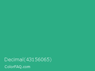 Decimal 43156065 Color is a normal green color and the nearest color is Jungle Green #29ab87. Hex code #2cae85 and RGB value is rgb(44,174,133). In RGB color space, this color is composed of 17% red, 68% green, 52% blue, In CMYK color space, this color is composed of 75% cyan, 0% magenta, 24% yellow , 32% black , In HSL color space, this color has a hue angle of 161° , 60% saturation and 43% lightness.