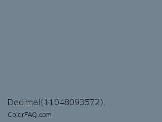 Decimal 11048093572 Color is a normal blue color and the nearest color is Slate Gray #708090. Hex code #748490 and RGB value is rgb(116,132,144). In RGB color space, this color is composed of 45% red, 52% green, 56% blue, In CMYK color space, this color is composed of 19% cyan, 8% magenta, 0% yellow , 44% black , In HSL color space, this color has a hue angle of 206° , 11% saturation and 51% lightness.