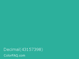 Decimal 43157398 Color is a normal cyan color and the nearest color is Keppel #3ab09e. Hex code #2cb09c and RGB value is rgb(44,176,156). In RGB color space, this color is composed of 17% red, 69% green, 61% blue, In CMYK color space, this color is composed of 75% cyan, 0% magenta, 11% yellow , 31% black , In HSL color space, this color has a hue angle of 171° , 60% saturation and 43% lightness.