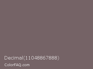 Decimal 11048867888 Color is a normal red color and the nearest color is Flint #6f6a61. Hex code #756366 and RGB value is rgb(117,99,102). In RGB color space, this color is composed of 46% red, 39% green, 40% blue, In CMYK color space, this color is composed of 0% cyan, 15% magenta, 13% yellow , 54% black , In HSL color space, this color has a hue angle of 350° , 8% saturation and 42% lightness.