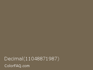Decimal 11048871987 Color is a normal orange color and the nearest color is Coffee #706555. Hex code #756751 and RGB value is rgb(117,103,81). In RGB color space, this color is composed of 46% red, 40% green, 32% blue, In CMYK color space, this color is composed of 0% cyan, 12% magenta, 31% yellow , 54% black , In HSL color space, this color has a hue angle of 37° , 18% saturation and 39% lightness.