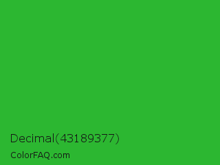 Decimal 43189377 Color is a normal green color and the nearest color is Wageningen Green #34b233. Hex code #2cb731 and RGB value is rgb(44,183,49). In RGB color space, this color is composed of 17% red, 72% green, 19% blue, In CMYK color space, this color is composed of 76% cyan, 0% magenta, 73% yellow , 28% black , In HSL color space, this color has a hue angle of 122° , 61% saturation and 45% lightness.