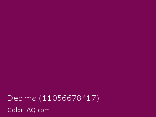Decimal 11056678417 Color is a dark magenta color and the nearest color is Rose Bud Cherry #800b47. Hex code #780653 and RGB value is rgb(120,6,83). In RGB color space, this color is composed of 47% red, 2% green, 33% blue, In CMYK color space, this color is composed of 0% cyan, 95% magenta, 31% yellow , 53% black , In HSL color space, this color has a hue angle of 319° , 90% saturation and 25% lightness.
