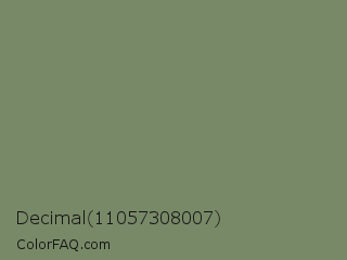 Decimal 11057308007 Color is a normal green color and the nearest color is Camouflage Green #78866b. Hex code #788967 and RGB value is rgb(120,137,103). In RGB color space, this color is composed of 47% red, 54% green, 40% blue, In CMYK color space, this color is composed of 12% cyan, 0% magenta, 25% yellow , 46% black , In HSL color space, this color has a hue angle of 90° , 14% saturation and 47% lightness.