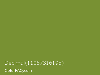Decimal 11057316195 Color is a normal lime color and the nearest color is Wasabi #788a25. Hex code #789133 and RGB value is rgb(120,145,51). In RGB color space, this color is composed of 47% red, 57% green, 20% blue, In CMYK color space, this color is composed of 17% cyan, 0% magenta, 65% yellow , 43% black , In HSL color space, this color has a hue angle of 76° , 48% saturation and 38% lightness.