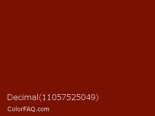 Decimal 11057525049 Color is a dark red color and the nearest color is Dark Burgundy #770f05. Hex code #791203 and RGB value is rgb(121,18,3). In RGB color space, this color is composed of 47% red, 7% green, 1% blue, In CMYK color space, this color is composed of 0% cyan, 85% magenta, 98% yellow , 53% black , In HSL color space, this color has a hue angle of 8° , 95% saturation and 24% lightness.
