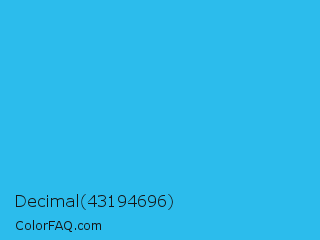 Decimal 43194696 Color is a normal blue color and the nearest color is Scooter #2ebfd4. Hex code #2cbcec and RGB value is rgb(44,188,236). In RGB color space, this color is composed of 17% red, 74% green, 93% blue, In CMYK color space, this color is composed of 81% cyan, 20% magenta, 0% yellow , 7% black , In HSL color space, this color has a hue angle of 195° , 83% saturation and 55% lightness.