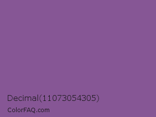 Decimal 11073054305 Color is a normal purple color and the nearest color is French Lilac #86608e. Hex code #865695 and RGB value is rgb(134,86,149). In RGB color space, this color is composed of 53% red, 34% green, 58% blue, In CMYK color space, this color is composed of 10% cyan, 42% magenta, 0% yellow , 42% black , In HSL color space, this color has a hue angle of 286° , 27% saturation and 46% lightness.