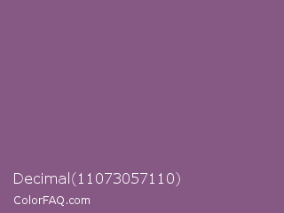 Decimal 11073057110 Color is a normal magenta color and the nearest color is Chinese Violet #856088. Hex code #865884 and RGB value is rgb(134,88,132). In RGB color space, this color is composed of 53% red, 35% green, 52% blue, In CMYK color space, this color is composed of 0% cyan, 34% magenta, 1% yellow , 47% black , In HSL color space, this color has a hue angle of 303° , 21% saturation and 44% lightness.