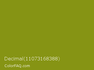 Decimal 11073168388 Color is a normal yellow color and the nearest color is Trendy Green #7c881a. Hex code #869414 and RGB value is rgb(134,148,20). In RGB color space, this color is composed of 53% red, 58% green, 8% blue, In CMYK color space, this color is composed of 9% cyan, 0% magenta, 86% yellow , 42% black , In HSL color space, this color has a hue angle of 67° , 76% saturation and 33% lightness.