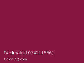 Decimal 11074211856 Color is a normal rose color and the nearest color is Rose Bud Cherry #800b47. Hex code #881542 and RGB value is rgb(136,21,66). In RGB color space, this color is composed of 53% red, 8% green, 26% blue, In CMYK color space, this color is composed of 0% cyan, 85% magenta, 51% yellow , 47% black , In HSL color space, this color has a hue angle of 337° , 73% saturation and 31% lightness.