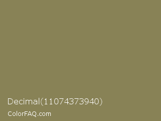 Decimal 11074373940 Color is a normal yellow color and the nearest color is Clay Creek #8a8360. Hex code #888256 and RGB value is rgb(136,130,86). In RGB color space, this color is composed of 53% red, 51% green, 34% blue, In CMYK color space, this color is composed of 0% cyan, 4% magenta, 37% yellow , 47% black , In HSL color space, this color has a hue angle of 53° , 23% saturation and 44% lightness.