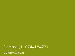 Decimal 11074418473 Color is a normal yellow color and the nearest color is Trendy Green #7c881a. Hex code #889511 and RGB value is rgb(136,149,17). In RGB color space, this color is composed of 53% red, 58% green, 7% blue, In CMYK color space, this color is composed of 9% cyan, 0% magenta, 89% yellow , 42% black , In HSL color space, this color has a hue angle of 66° , 80% saturation and 33% lightness.