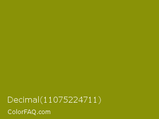 Decimal 11075224711 Color is a dark yellow color and the nearest color is Olive #808000. Hex code #899207 and RGB value is rgb(137,146,7). In RGB color space, this color is composed of 54% red, 57% green, 3% blue, In CMYK color space, this color is composed of 6% cyan, 0% magenta, 95% yellow , 43% black , In HSL color space, this color has a hue angle of 64° , 91% saturation and 30% lightness.