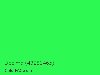 Decimal 43283465 Color is a normal green color and the nearest color is Malachite #0bda51. Hex code #2cf951 and RGB value is rgb(44,249,81). In RGB color space, this color is composed of 17% red, 98% green, 32% blue, In CMYK color space, this color is composed of 82% cyan, 0% magenta, 67% yellow , 2% black , In HSL color space, this color has a hue angle of 131° , 94% saturation and 57% lightness.