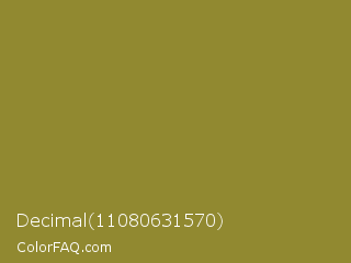 Decimal 11080631570 Color is a normal yellow color and the nearest color is Sycamore #908d39. Hex code #918930 and RGB value is rgb(145,137,48). In RGB color space, this color is composed of 57% red, 54% green, 19% blue, In CMYK color space, this color is composed of 0% cyan, 6% magenta, 67% yellow , 43% black , In HSL color space, this color has a hue angle of 55° , 50% saturation and 38% lightness.