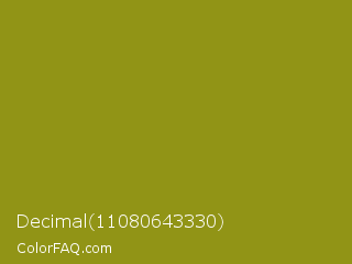 Decimal 11080643330 Color is a normal yellow color and the nearest color is Dark Yellow #9b870c. Hex code #919416 and RGB value is rgb(145,148,22). In RGB color space, this color is composed of 57% red, 58% green, 9% blue, In CMYK color space, this color is composed of 2% cyan, 0% magenta, 85% yellow , 42% black , In HSL color space, this color has a hue angle of 61° , 74% saturation and 33% lightness.
