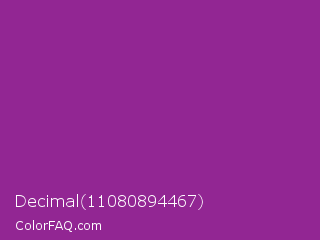 Decimal 11080894467 Color is a normal magenta color and the nearest color is Violet Eggplant #991199. Hex code #922693 and RGB value is rgb(146,38,147). In RGB color space, this color is composed of 57% red, 15% green, 58% blue, In CMYK color space, this color is composed of 1% cyan, 74% magenta, 0% yellow , 42% black , In HSL color space, this color has a hue angle of 299° , 59% saturation and 36% lightness.