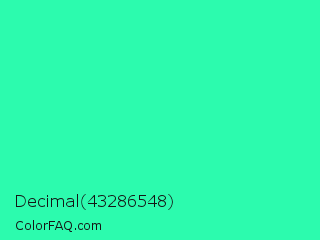 Decimal 43286548 Color is a normal green color and the nearest color is Eucalyptus #44d7a8. Hex code #2cfbae and RGB value is rgb(44,251,174). In RGB color space, this color is composed of 17% red, 98% green, 68% blue, In CMYK color space, this color is composed of 82% cyan, 0% magenta, 31% yellow , 2% black , In HSL color space, this color has a hue angle of 158° , 96% saturation and 58% lightness.