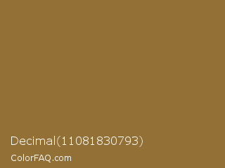 Decimal 11081830793 Color is a normal orange color and the nearest color is Metallic Sunburst #9c7c38. Hex code #937035 and RGB value is rgb(147,112,53). In RGB color space, this color is composed of 58% red, 44% green, 21% blue, In CMYK color space, this color is composed of 0% cyan, 24% magenta, 64% yellow , 42% black , In HSL color space, this color has a hue angle of 38° , 47% saturation and 39% lightness.