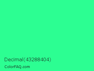 Decimal 43288404 Color is a normal green color and the nearest color is Medium Spring Green #00fa9a. Hex code #2cfe92 and RGB value is rgb(44,254,146). In RGB color space, this color is composed of 17% red, 100% green, 57% blue, In CMYK color space, this color is composed of 83% cyan, 0% magenta, 43% yellow , 0% black , In HSL color space, this color has a hue angle of 149° , 99% saturation and 58% lightness.